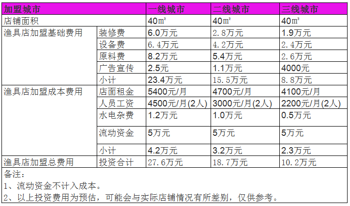 根據投資者所規劃的門店大小、地理位置等因素都會影響到門店的租金費用。通常在城市里,一個50平米左右的門店,一個月的房租大概在一萬左右,那些火爆的商圈價格肯定會高一點。而裝修費用:由于漁具店面向的都是大眾消費者,裝修只需簡約、明亮、大方得體即可,裝修費按照每平米450元計算,一個50平米的漁具店裝修費用便是22500元。