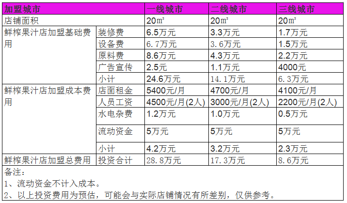 設(shè)備費都是固定的,開鮮榨果汁店所需要的設(shè)備包括榨汁機,攪拌機,制冰機,封口機等等這部分則需要3萬元左右。開店原材料費也不必可少,原材料包括水果,牛奶這部分需要支出2000-3000元左右。人員工資至少要2500元,水電雜費一個月則需要五六百元。由此可見,以二線城市為例,開一家20平方米左右的店鋪則需要前期投入8-10萬元左右。